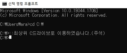 저는 cd C:\ 커멘드를 입력하여 C드라이브로 이동하였습니다.