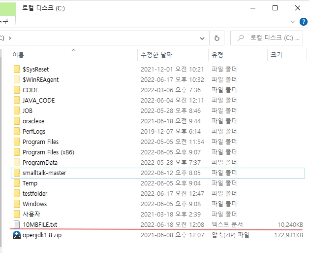 이후 위의 사진과 같이 “10MBFILE.txt 파일 작성” 이라는 알림이 뜨면 성공입니다.