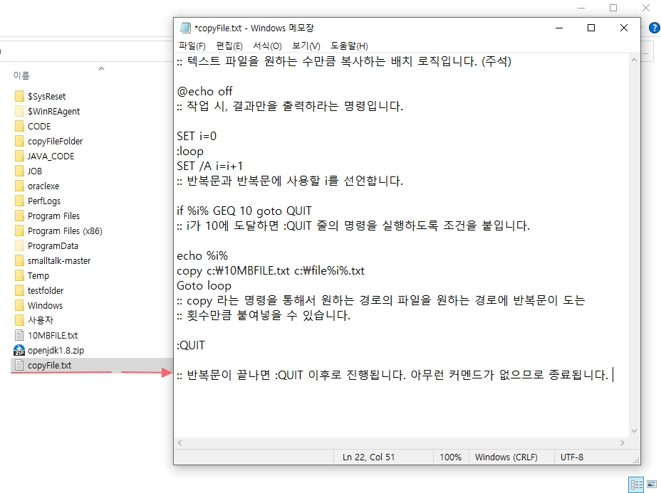 :: 텍스트 파일을 원하는 수만큼 복사하는 배치 로직입니다. (주석)