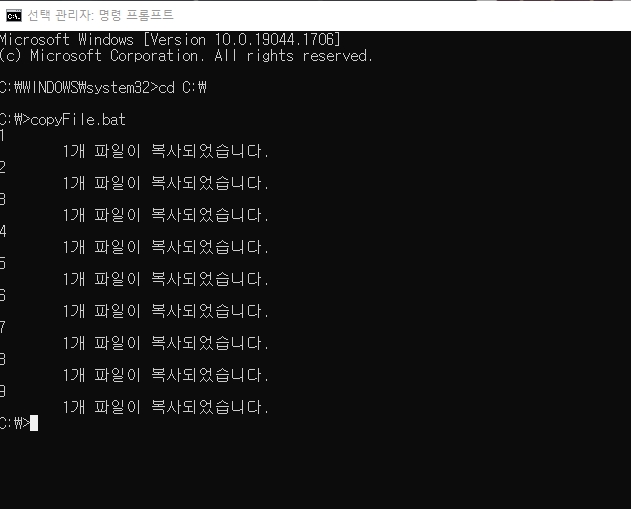 :: copy 라는 명령을 통해서 원하는 경로의 파일을 원하는 경로에 반복문이 도는