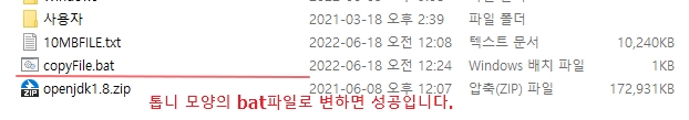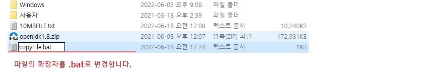 이후 파일 이름 변경을 통해 확장자를 .bat 으로 변경합니다.