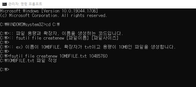 :: fsutil file createnew [파일이름] [파일사이즈]