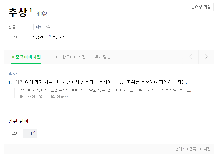 이렇게 여러 사물에서 공통된 특성을 뽑아내어 더 적은 수의 단어로 묘사하는 것을 "추상화" 라고 합니다.