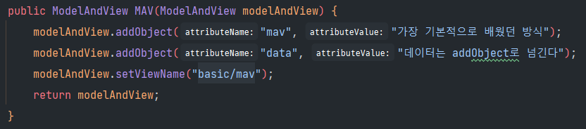 우선 해당 소스는 ModelAndView에 데이터를 담아서 타임리프로 구성된 페이지에 넣은 뒤 해당 텍스트를 화면에 보여주는 예제이다.