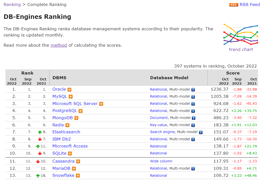 Ranking > Method Method of calculating the scores of the DB-Engines Ranking The DB-Engines Ranking is a list of database management systems ranked by their current popularity. We measure the popularity of a system by using the following parameters: Number