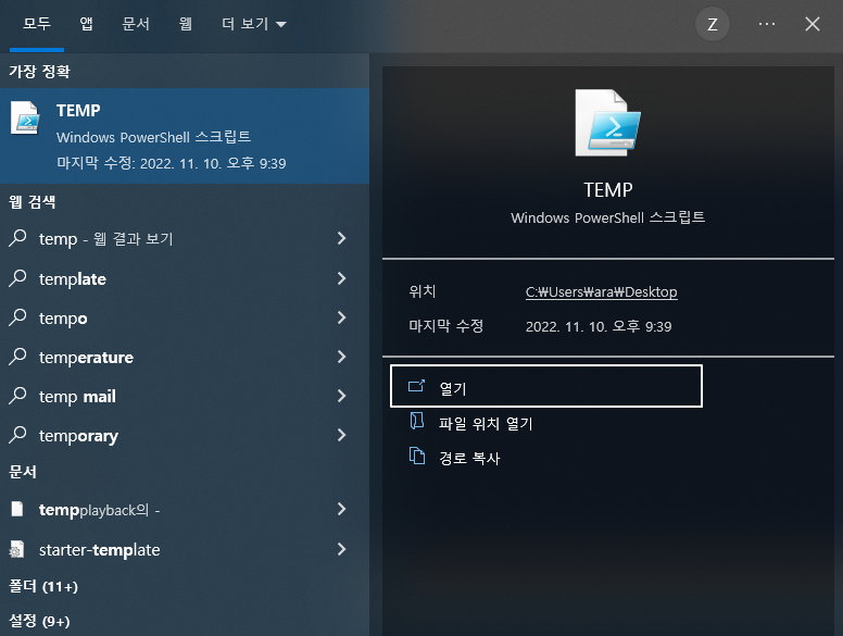 다만 한가지 아쉬운 점은 ps1파일은 windows 검색에서 powershell을 통해 바로 열리지 않는다는 점인데요.