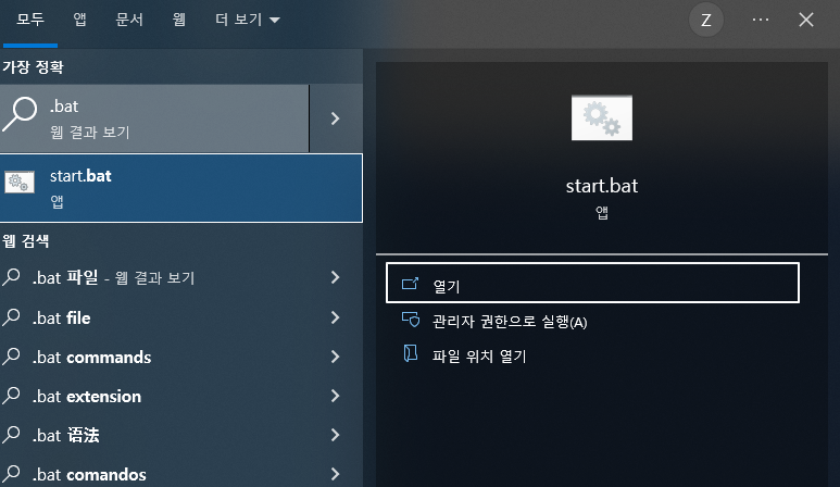 window 키를 눌러 검색하는 경우, .bat 파일들은 바로 실행이 가능하지만