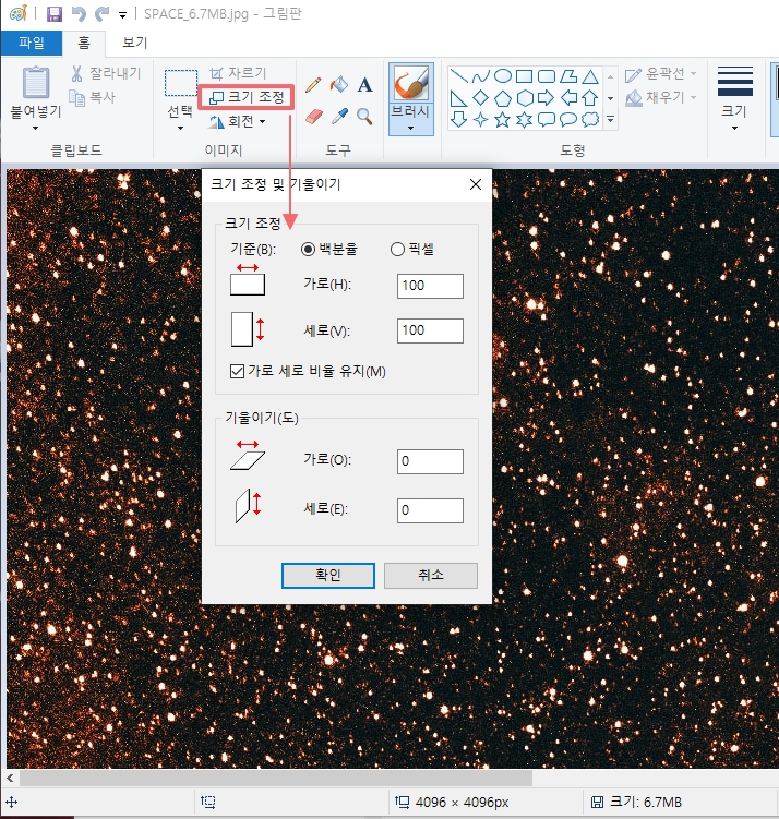 크기 조정에서 백분율, 혹은 픽셀을 조절하여 크기를 바꾸면 용량을 늘리거나 줄인 이미지를 얻을 수 있습니다.